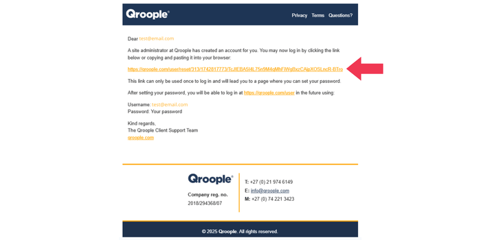 You will receive a notification email from Qroople. Please click the provided URL to create your private password. Please keep your new password safe.